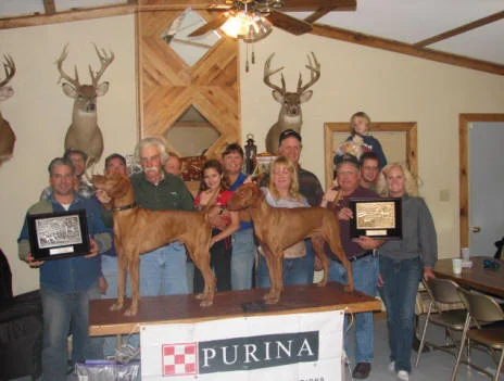 The National Vizsla Association held its 3rd Annual National Quail Classic and companion Derby Classic on October 16-18 on the beautiful Hickman Ranch outside of Grand River, Iowa. The drawing was conducted at the Westerville Lodge on the eve of the trial, October 15th. Stakes manager Matt Rogers, NVA president Robert Tomczak, and participant Grace Ann Lawson took care off the details during the cocktail hour sponsored by Mark Johnson. Mark is the current president of the Field Trial Clubs of Illinois and was participant, helper, donor, and last minute judge.